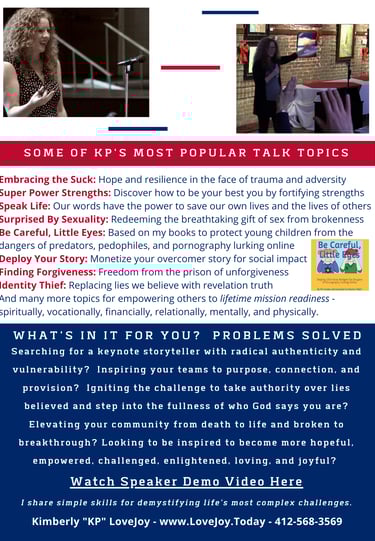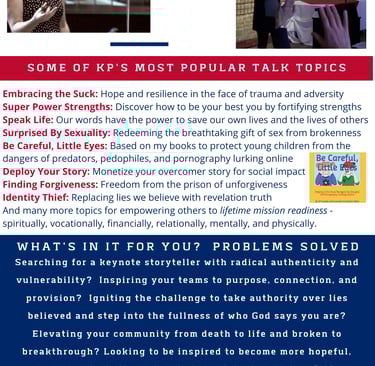 Join KP at the United States Air Force Academy (USAFA) during one of her keynote storytelling sessions. Lessons in leadership. Reflective mirrors. Surrounding ourselves with the right influences. Is there at point to life? Embracing the suck. Always look for the rainbow. Can we prevent suicide? Join KP during her time with leaders during the resilience stand down at United States Air Force Academy.